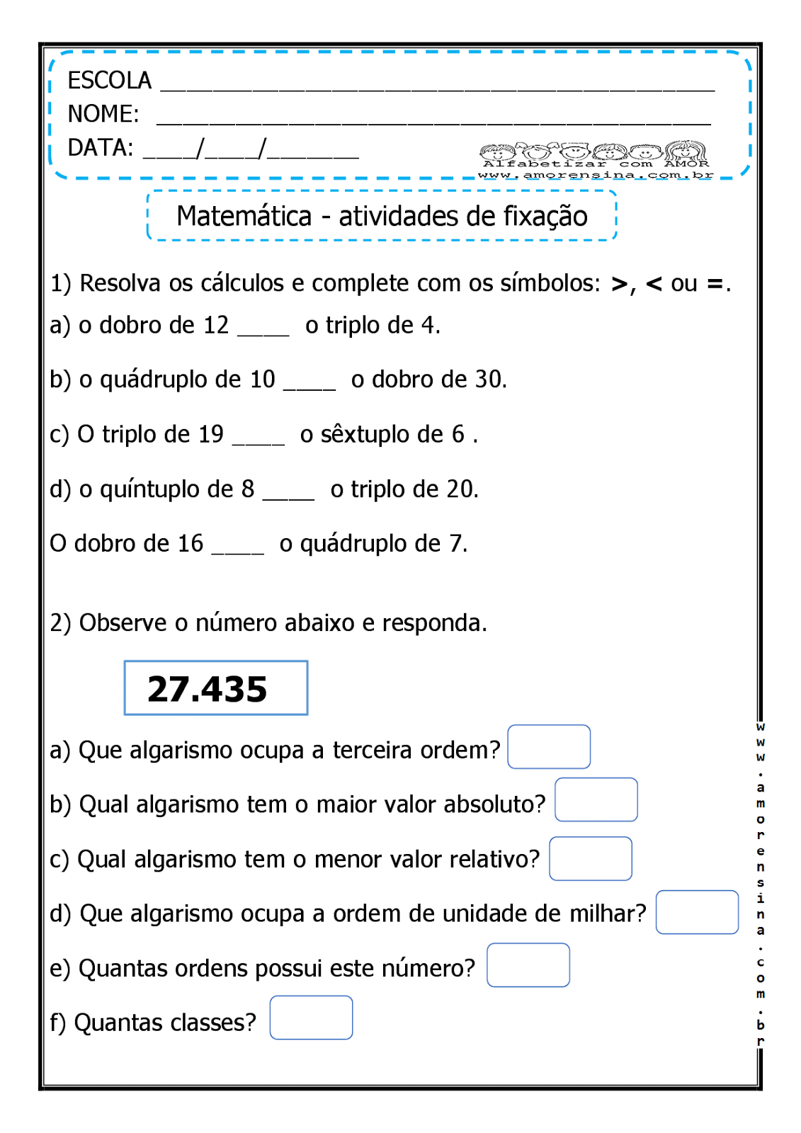 Atividades de matemática 4º ano